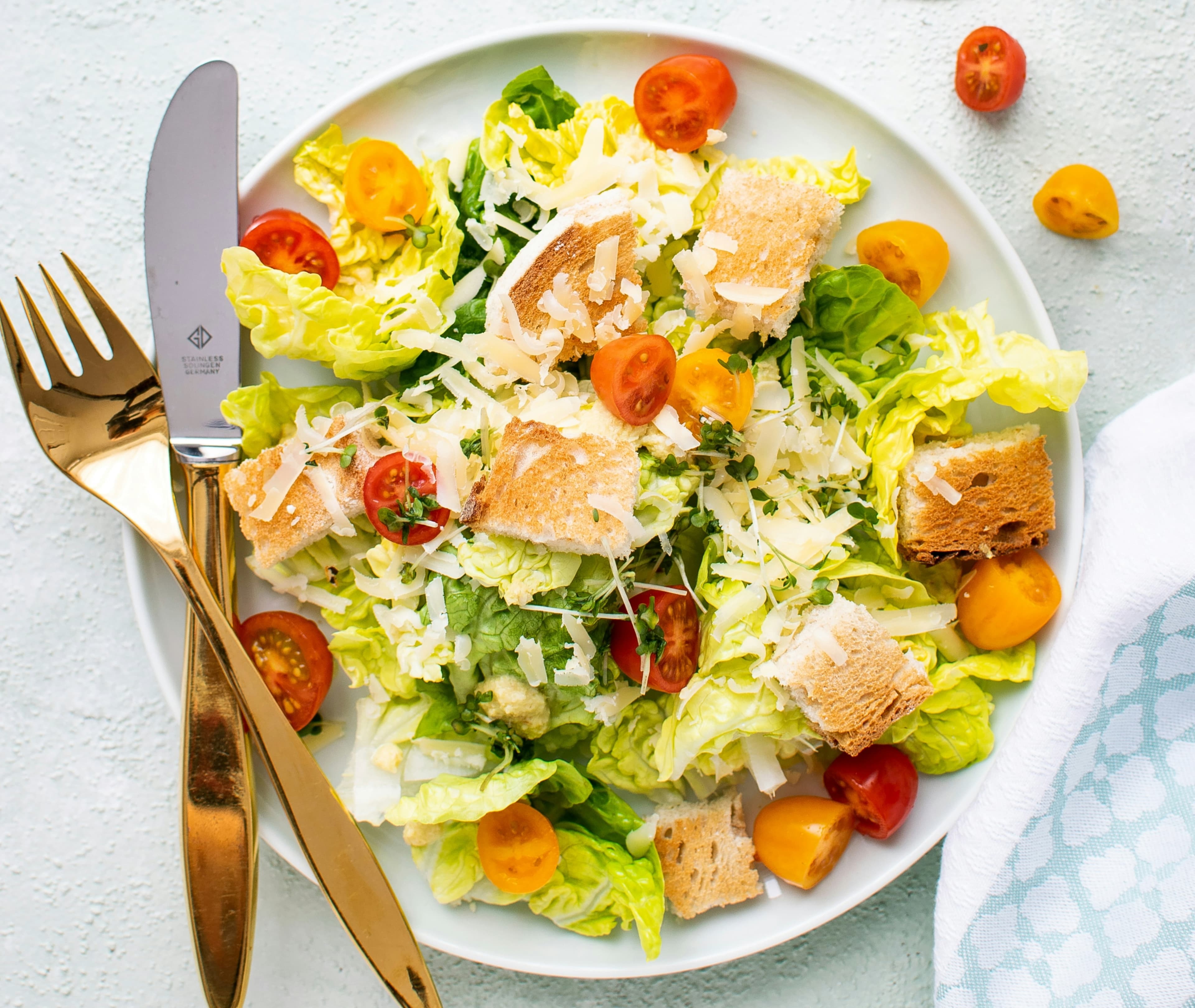 Lettuce with garlicky croutons and tomato, shaved Parmesan, in our signature vegetarian dairy-free Caesar dressing