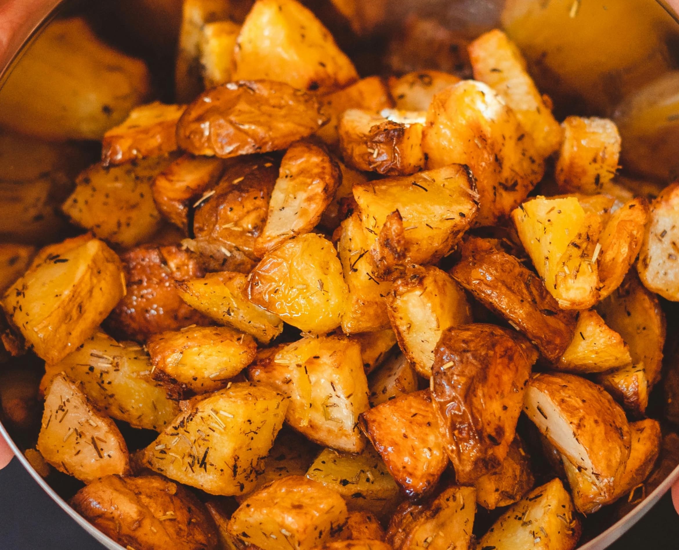 Herb-roasted baby potatoes with rosemary, thyme, and roasted garlic. Finished with lemon zest